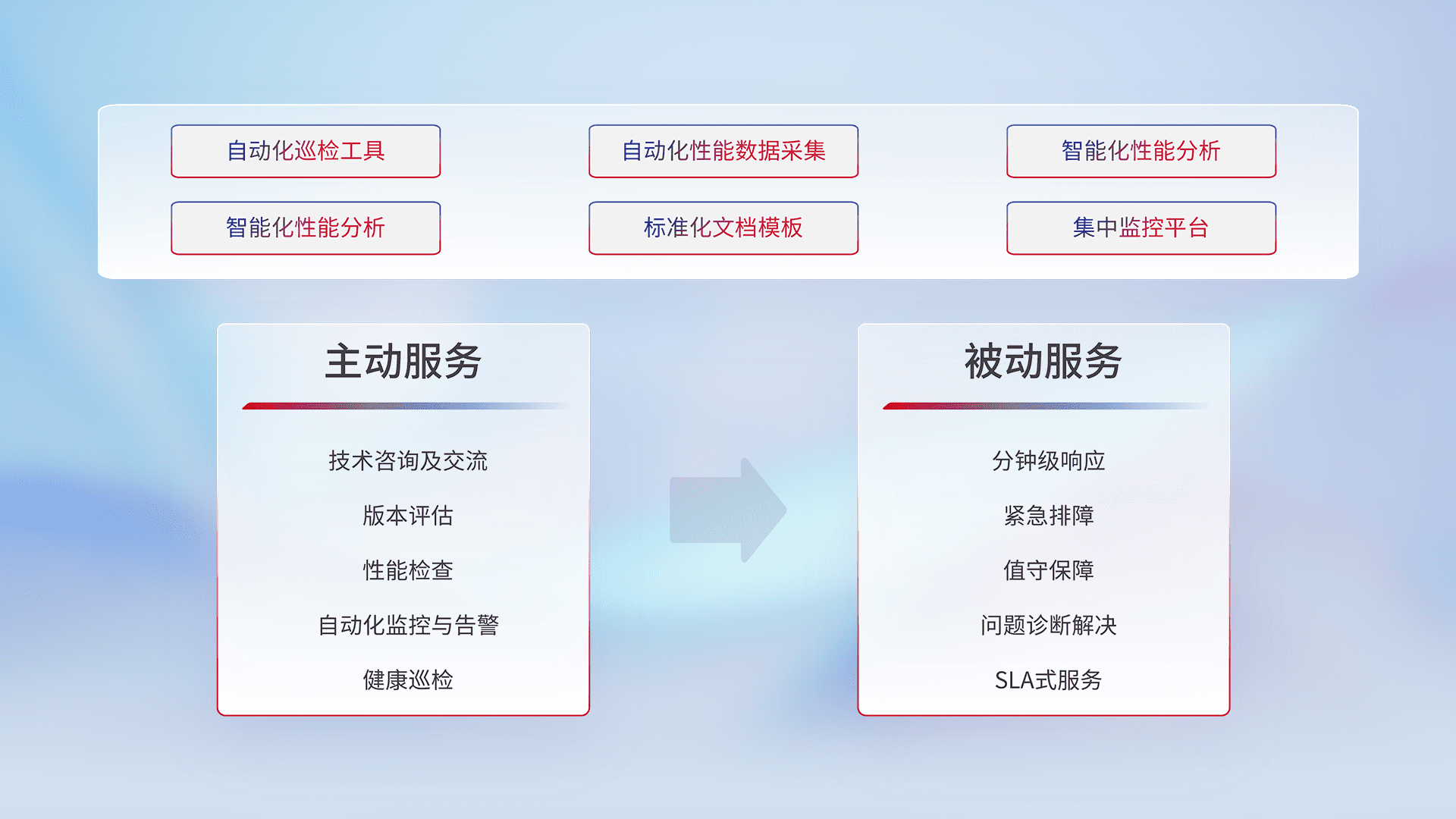 智能化工具和标准化文档,,保障服务质量,,,提供主动服务(包含技术咨询、、版本评估、、、、性能检查、、自动化监控与告警、、、健康巡检)和被动服务包含(分钟级响应、、紧急排障、、、值守保障、、、问题诊断解决、、、SLA服务)。。。